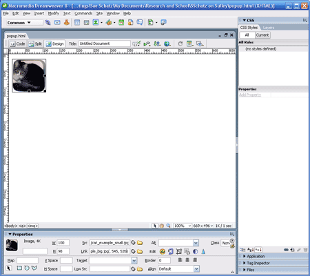 This example demonstrates how to create basic JavaScript pop-up windows. We will create two versions of an image: a small, thumbnail version and a large, full-sized version. When a viewer clicks on the thumbnail, a new window containing the full-sized image will pop open. The new window will be sized to fit the full-sized image.