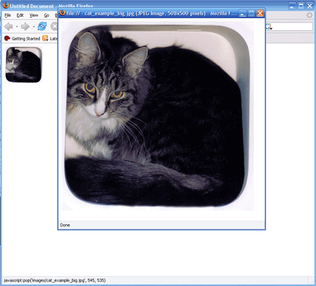 For me, I entered: javascript:pop('images/cat_example_big.jpg', 545, 535), since I called my large image "cat_example_big.jpg" and I placed it in the "images" directory. My large image is 508 pixels wide, so I entered "545" for the window's width. The width of the window has to be about 40 pixels larger than the size of the image. This extra width is filled by padding, scrollbars, etc. My large image is 500 pixels high, so I entered "535" for the window's height. Again, the extra pixels are filled with padding.