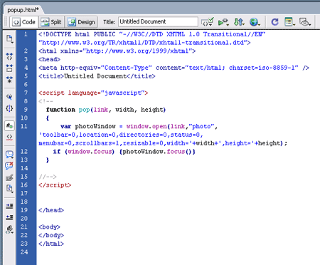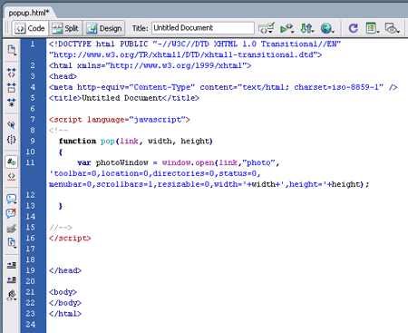 This bit of JavaScript is a function, which I have named "pop." When "pop" is called (in the HTML document), it must be sent three arguments: "link", "width" and "height." Link is the address of the file that will be displayed in the pop-up window. Width is the width of the new window, and height is the height of that tnew window. In the JavaScript, I have set toolbar=0, which means that the new window's toolbar will not display. If, instead, I set toolbar=1, then the toolbar would be shown.